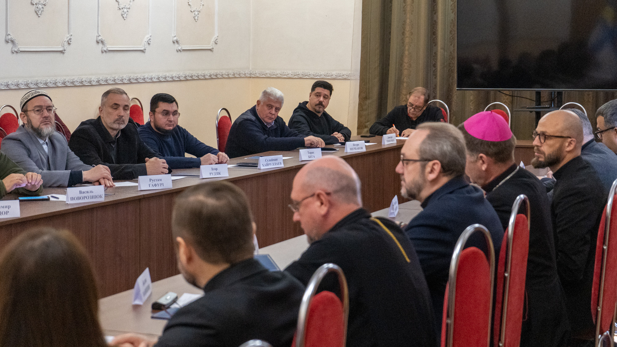 The meeting was attended by authorized representatives of the Ukrainian Bible Society, the Orthodox Church of Ukraine, the Ukrainian Greek Catholic Church, the Roman Catholic Church in Ukraine, the All-Ukrainian Union of Churches of Evangelical Christians-Baptists, and the Ukrainian Church of Christians of Evangelical Faith, The Seventh-day Adventist Church in Ukraine, the Ukrainian Christian Evangelical Church, the Ukrainian Lutheran Church, the Spiritual Directorate of Muslims of Ukraine, the Spiritual Directorate of Muslims of the Autonomous Republic of Crimea, along with representatives of other public, religious and charitable organizations. The meeting of the Council of Churches representatives and the Ministry of Veterans Affairs of Ukraine was organized with the assistance of the UCCRO Social Service Commission.