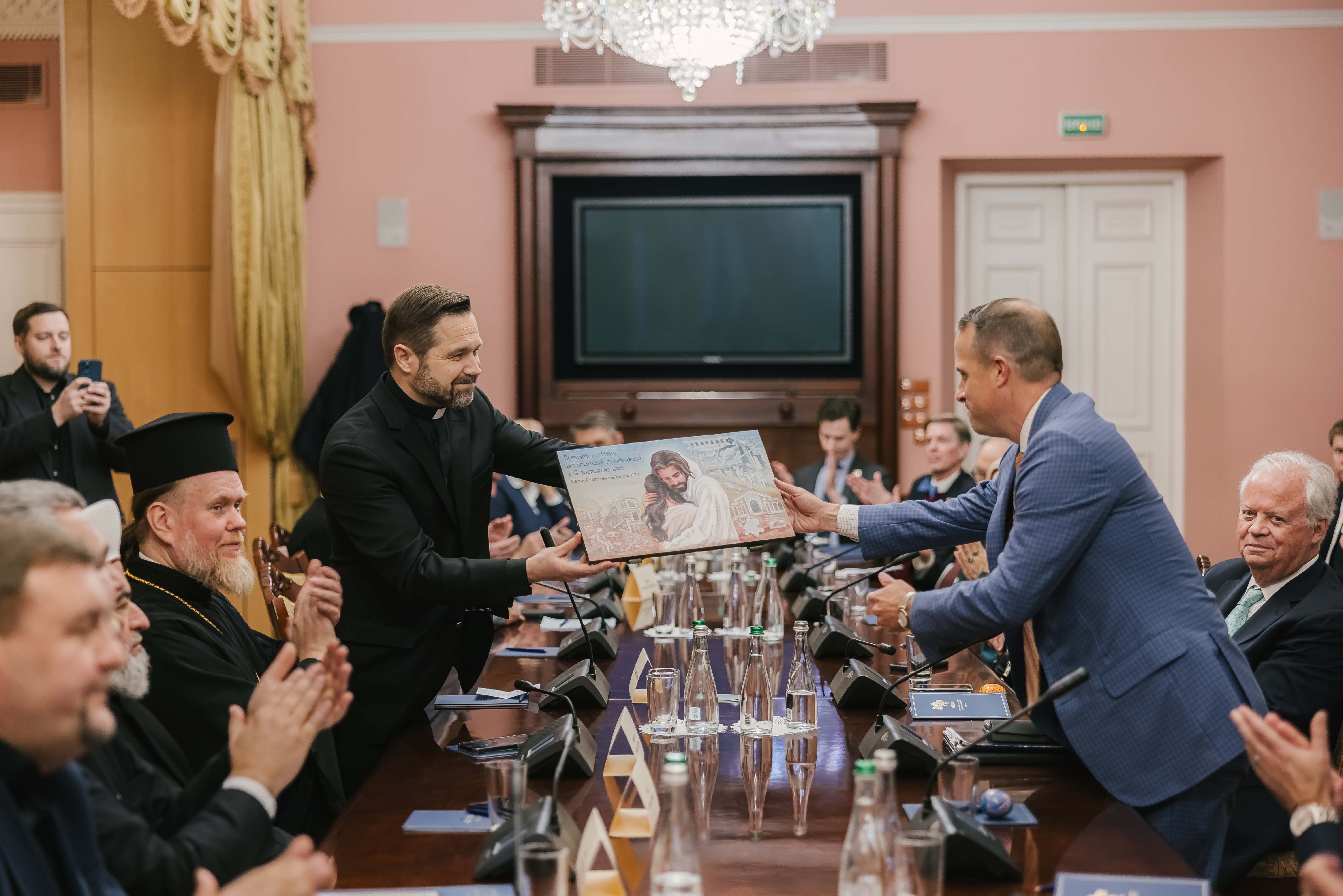 In memory of the meeting, on behalf of the UCCRO, the American delegation was presented with a painting created on boards from ammunition boxes from the Avdiivka area. The artwork depicts a man in the arms of Jesus Christ amidst the ruins resulting from Russian attacks on Ukrainian cities. A Bible verse is written on the painting: “Come to me, all you who are weary and burdened, and I will give you rest” (Matthew 11:28).
